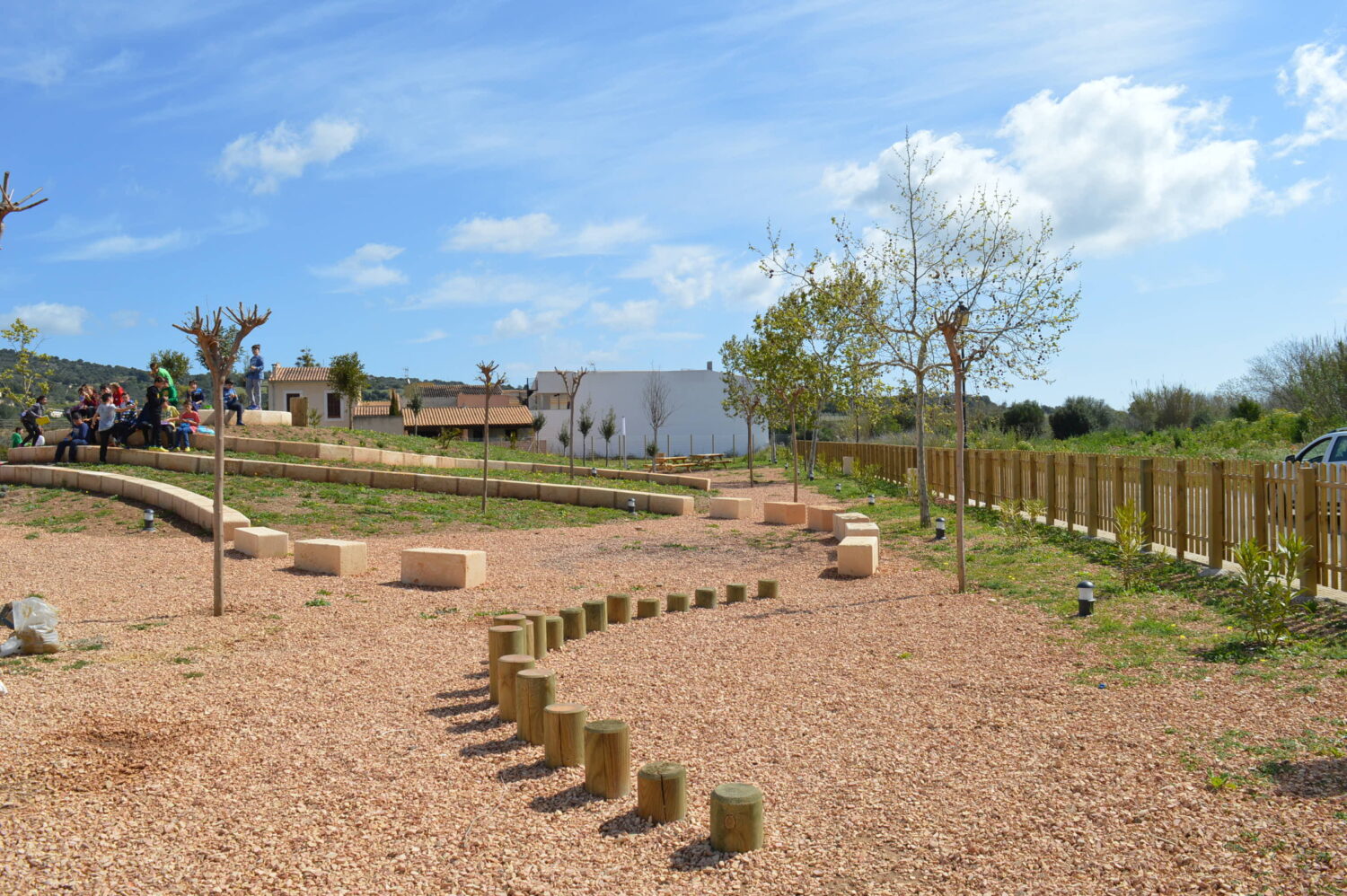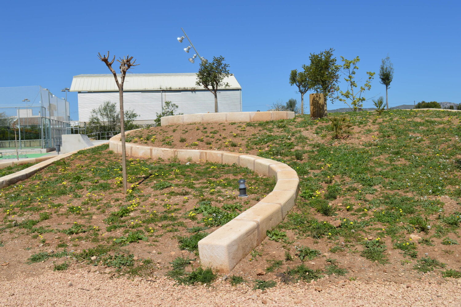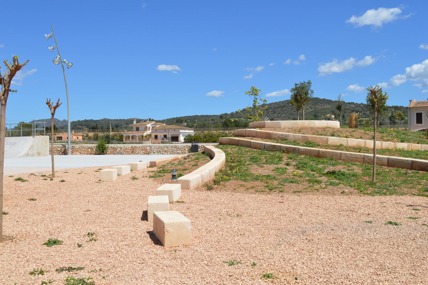 La resta del parc es va deixar amb una imatge molt més natural, on la vegetació és la protagonista. Amb les terres procedents de l’excavació es realitza una petita muntanya amb maresos formant unes grades cap a la zona de jocs i de skate. Es varen sembrar arbres autòctons com l’olivera, el garrover i l’alzina, també es varen sembrar diferents tipus d’herbes aromàtiques acompanyant als maresos, i adossats a la tanca perimetral que dona a la carretera es sembraren baladres de diferents colors.