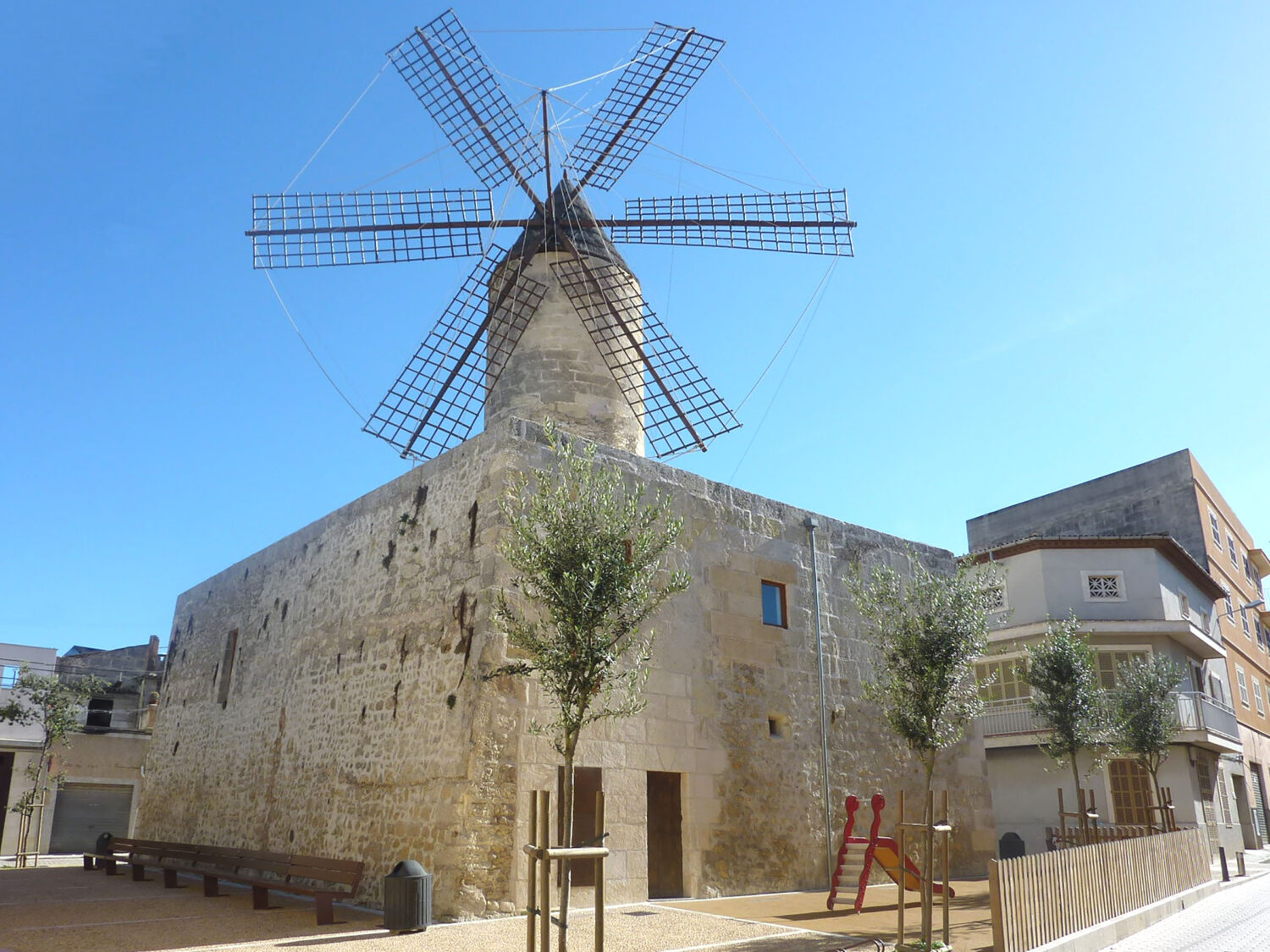 La restauració del molí fariner den Fraret es va realitzar en un parell de fases: primer el Consell de Mallorca va restaurar la torre, l’escala central de marés i va posar les antenes. Posteriorment l’Ajuntament de Manacor ens va encarregar la restauració de les façanes en una primera fase i la restauració de l’interior i l’adequació de la plaça i carrers dels voltants en una segona fase. En tot moment es va intentar utilitzar materials tradicionals semblants als originals, com el marés i els morters de calç, tant per les juntes de la paret de pedra com dels referits interiors i exteriors. A l’interior del molí s’habilitaren uns banys i a l’exterior es va afegir un ascensor per tal de garantir l’accessibilitat al pis superior. Aquest es va folrar amb planxa d’acer corten, pensant que seria la millor imatge per un element amb voluntat de respecte i de contemporaneïtat. Actualment el molí acull la secció etnològica del Museu d’Història de Manacor i la seu de l’Associació de Veïns Tramuntana. Pel que fa a la plaça i carrers es va reduir l’accés rodat, augmentant notablement la zona de vianants, es va afegir una zona de jocs infantils, es van sembrar arbres autòctons i es dotà d’il·luminació exterior la base del molí i la torre.